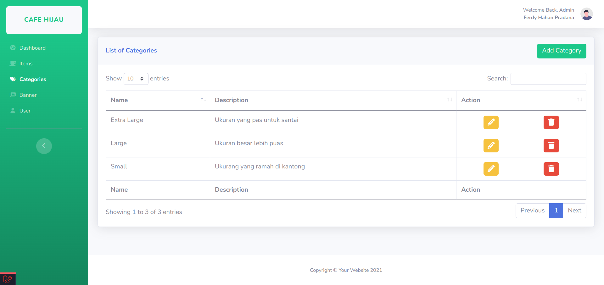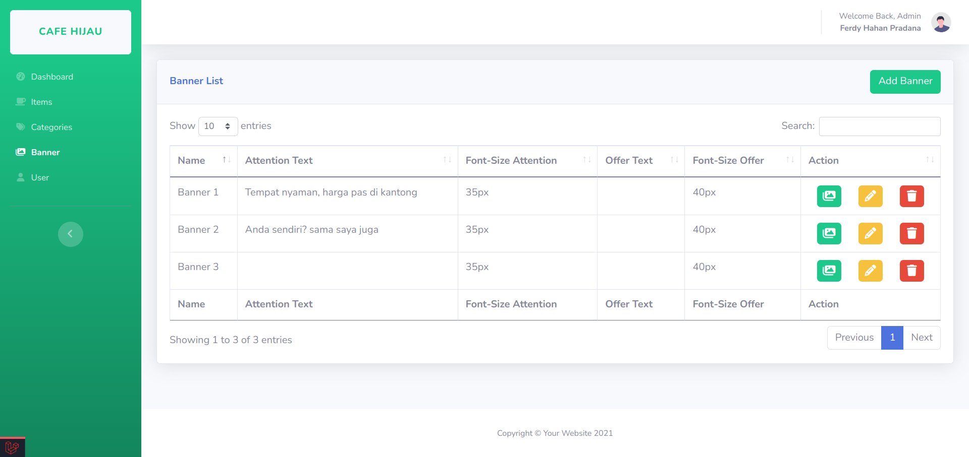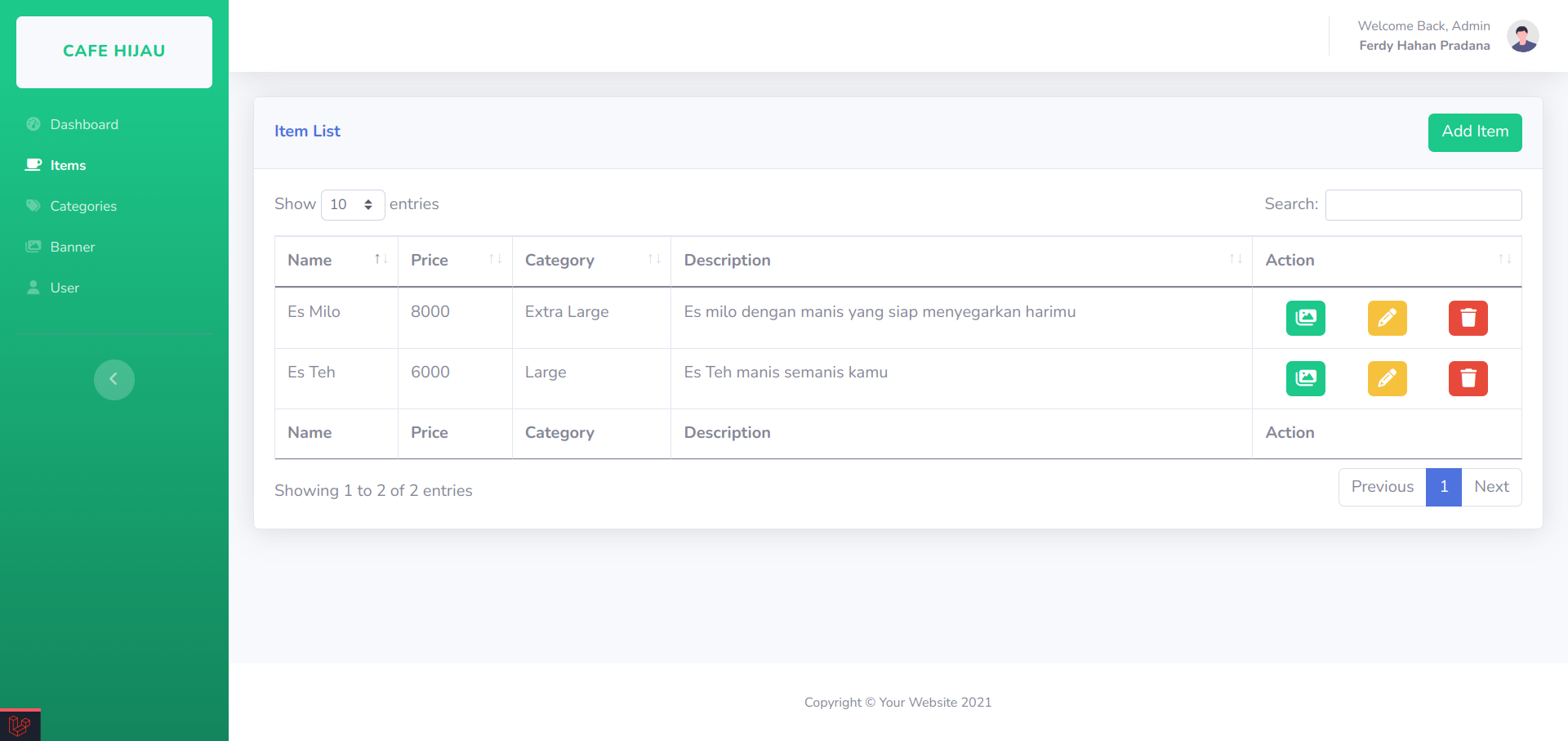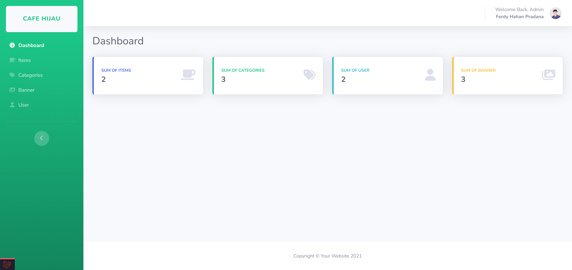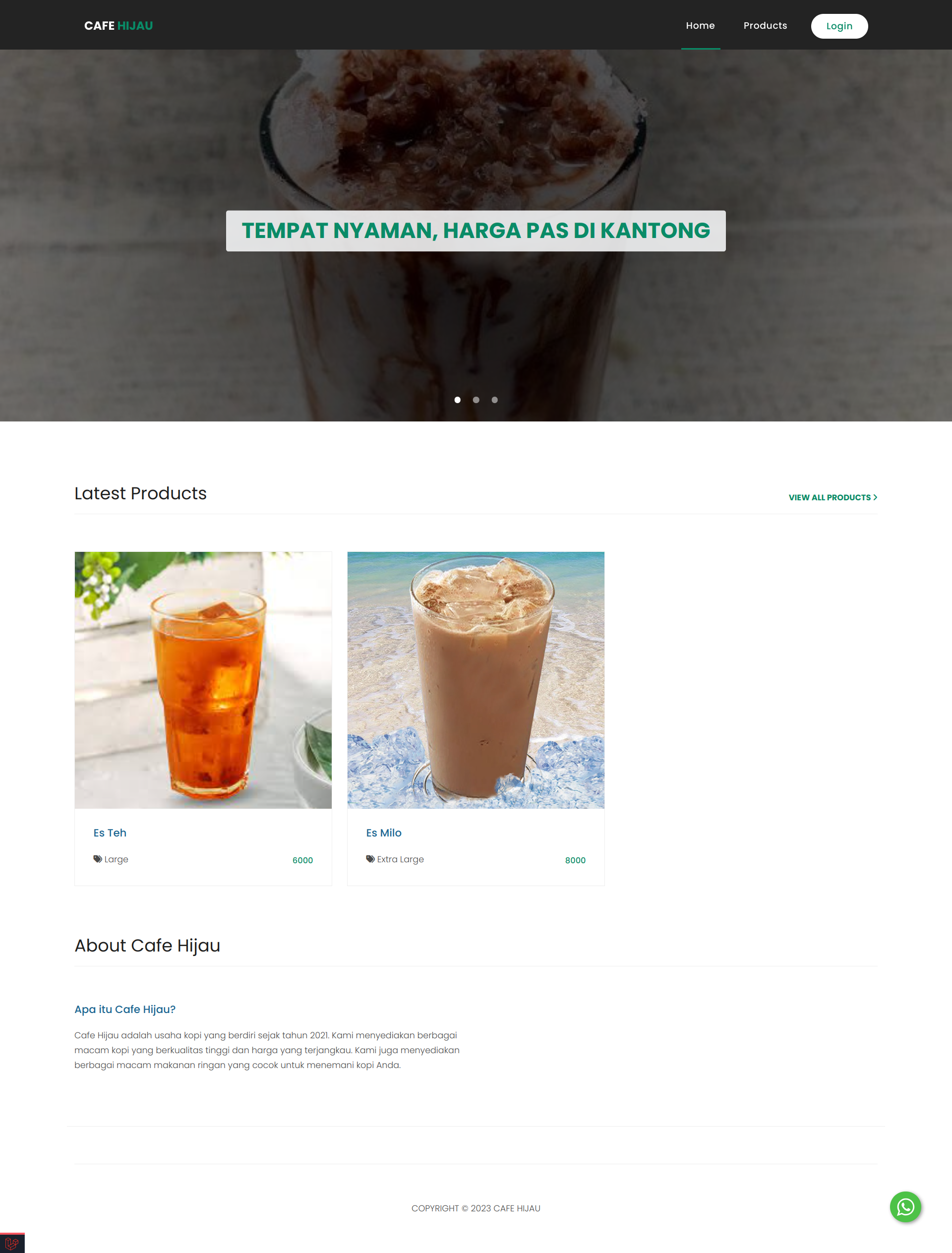 The 'Cafe Hijau' website provides a modern and attractive online presence for this cafe. The site features a visually appealing landing page that highlights the homepage and product details. The site includes strong authentication for secure user access, a comprehensive dashboard for easy management, and a detailed product and category management system. CMS banner management enables dynamic content updates, while user management ensures seamless interaction and control.