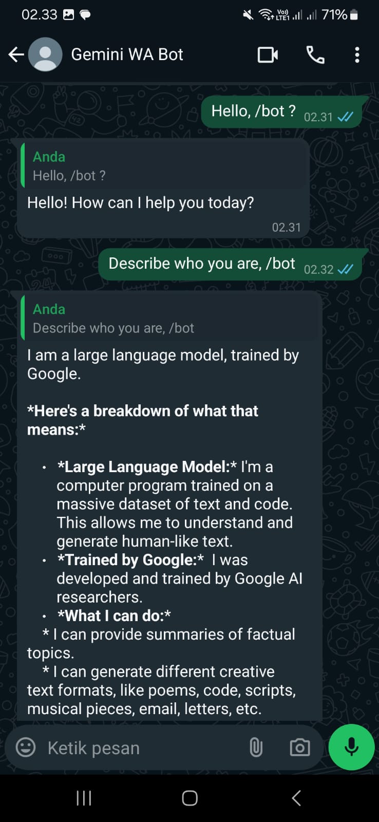 WABot Gemini is a playful project that demonstrates how to create a WhatsApp bot using Node.js and the whiskeysockets/baileys library, with integration to the Gemini API. This project was developed as a personal experiment to explore WhatsApp bot functionalities.