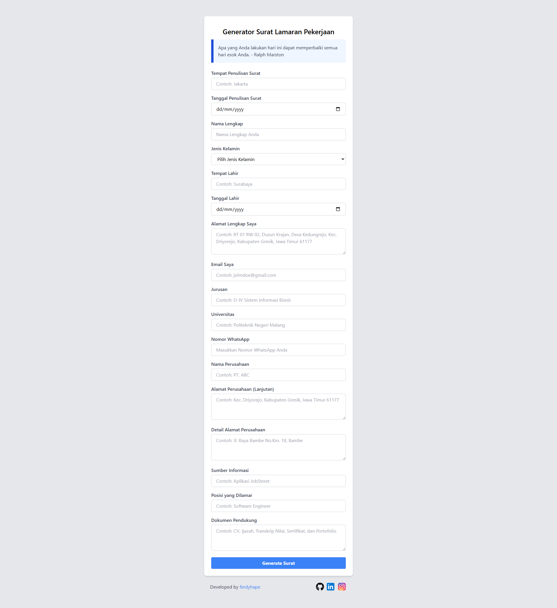 This project aims to create a very simple web application that allows users to automatically create cover letters. This tool can generate relevant and customized cover letter content based on user input. The generated cover letter will be exported in .docx document format, which is already formatted according to the standard of a simple cover letter.