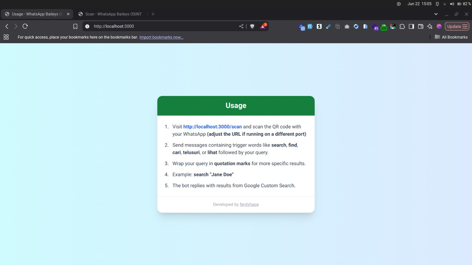 I'm not always excited about manually searching for open source intelligence online, so I built a simple WhatsApp bot that handles this for me automatically. This project aims to create an easy-to-use bot powered by Node.js and the Baileys library, which listens for specific trigger keywords on WhatsApp and performs Google Custom Search queries. The search results are then sent right back to the user within WhatsApp. It’s a lightweight tool designed to streamline OSINT tasks and deliver relevant info without switching apps.