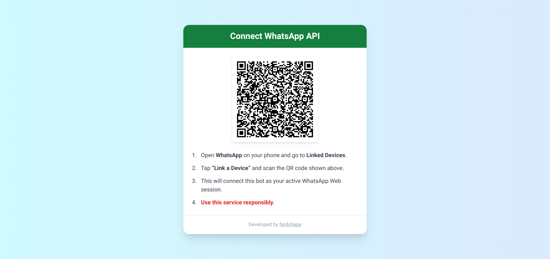 Built with Node.js, Express, and the Baileys library, this tool turns any WhatsApp account into a programmable messaging endpoint. You scan a QR code once to link your device, and then you're good to go, just send a POST request with the phone number and message, and it handles the rest.